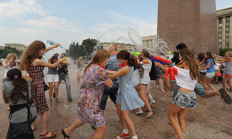 In spite of the fact that heat in Saint-Petersburg is less oppressive than in Moscow, water procedures haven’t lost their actuality. Look at the water battle of teenagers on the Moscow Square of Russia’s Northern capital.